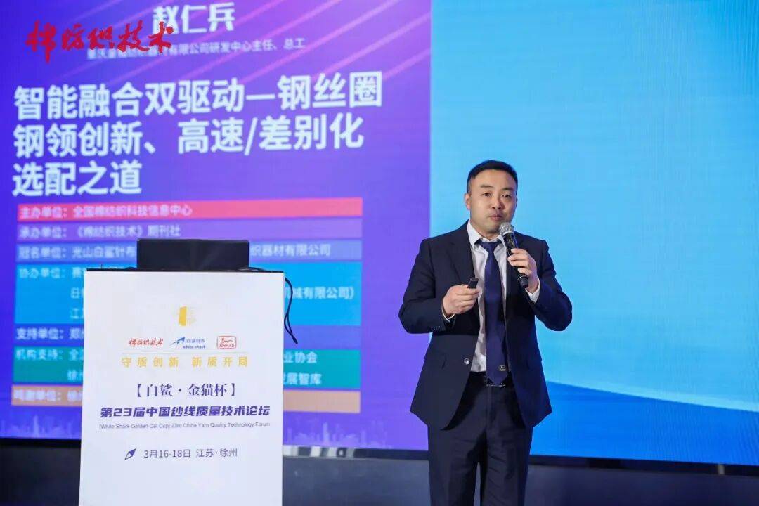 沉庆金猫纺织器材无限公司研发核心从任赵仁兵做了题为“智能融合双驱动——环绕钢丝圈钢领立异、高速/不同化选配之道”的演讲。